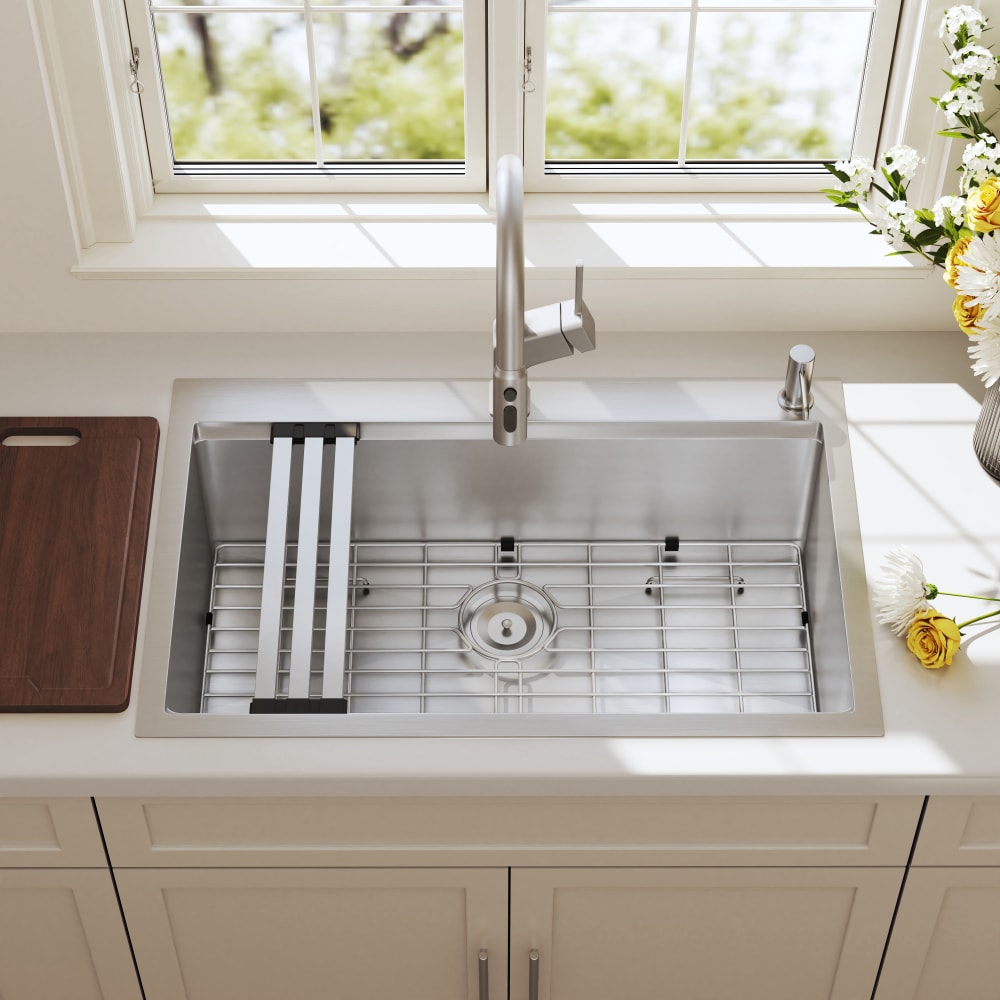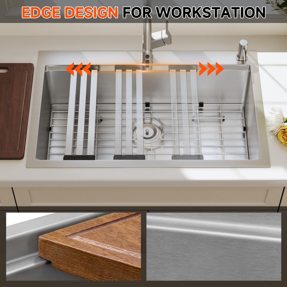 WORKSTATION FUNCTION: Blenzia 33x22 inch workstation sink provides you with more space to use, making it a functional station for preparing food. The edge stand workstation allows you to slide the cutting board and rolling rack on the spoon to hide it when not in use, maximize the cleanliness of the kitchen sink area