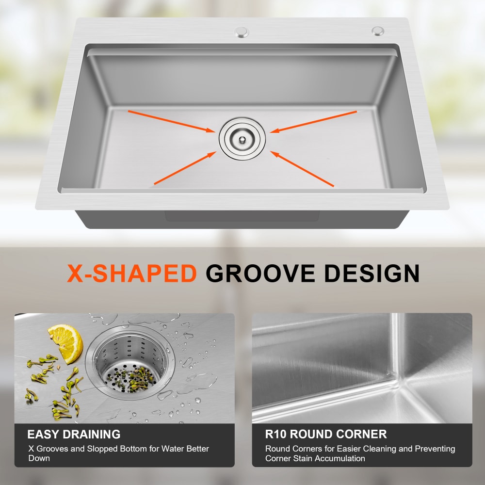 DROP IN INSTALLATION METHOD: This sink features a drop-in installation method for quick and easy setup. Packaged with comprehensive instructions and accessories, its U-channel design ensures stability on countertops