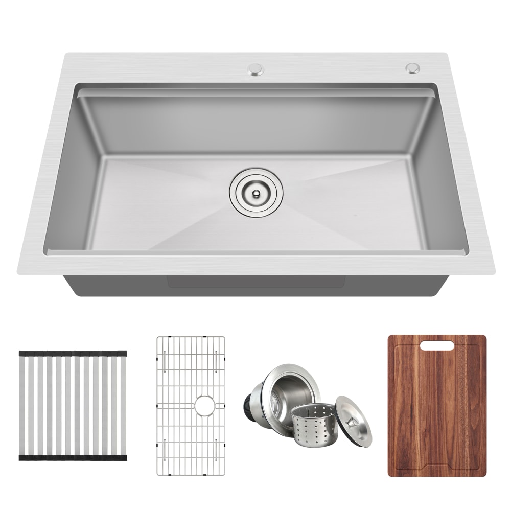 Blenzia 33 Inch Workstation Drop In Kitchen Sink 33x22 Topmount 16 Gauge Stainless Steel Deep Spacious Single Bowl Handmade Sinks with Ledge 33" x 22" x 9"
