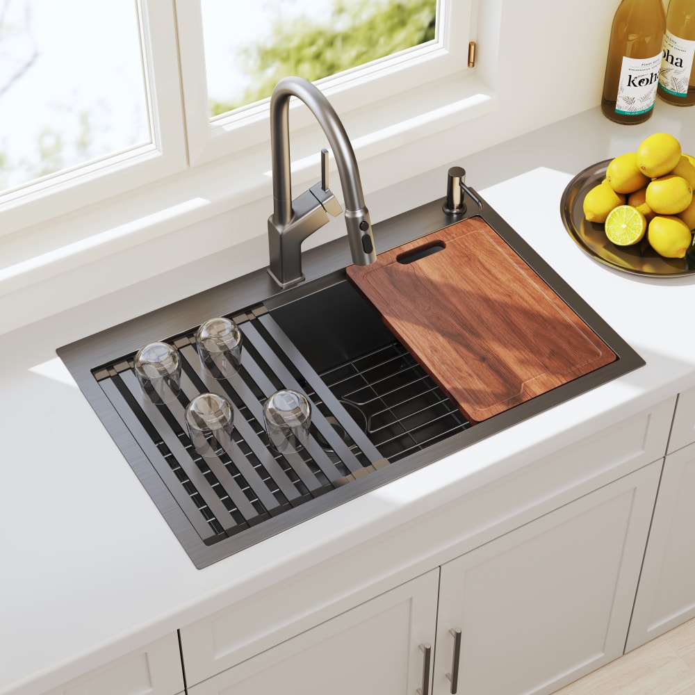 WORKSTATION FUNCTION: Blenzia 33x22 inch workstation sink provides you with more space to use, making it a functional station for preparing food. The edge stand workstation allows you to slide the cutting board and rolling rack on the spoon to hide it when not in use, maximize the cleanliness of the kitchen sink area