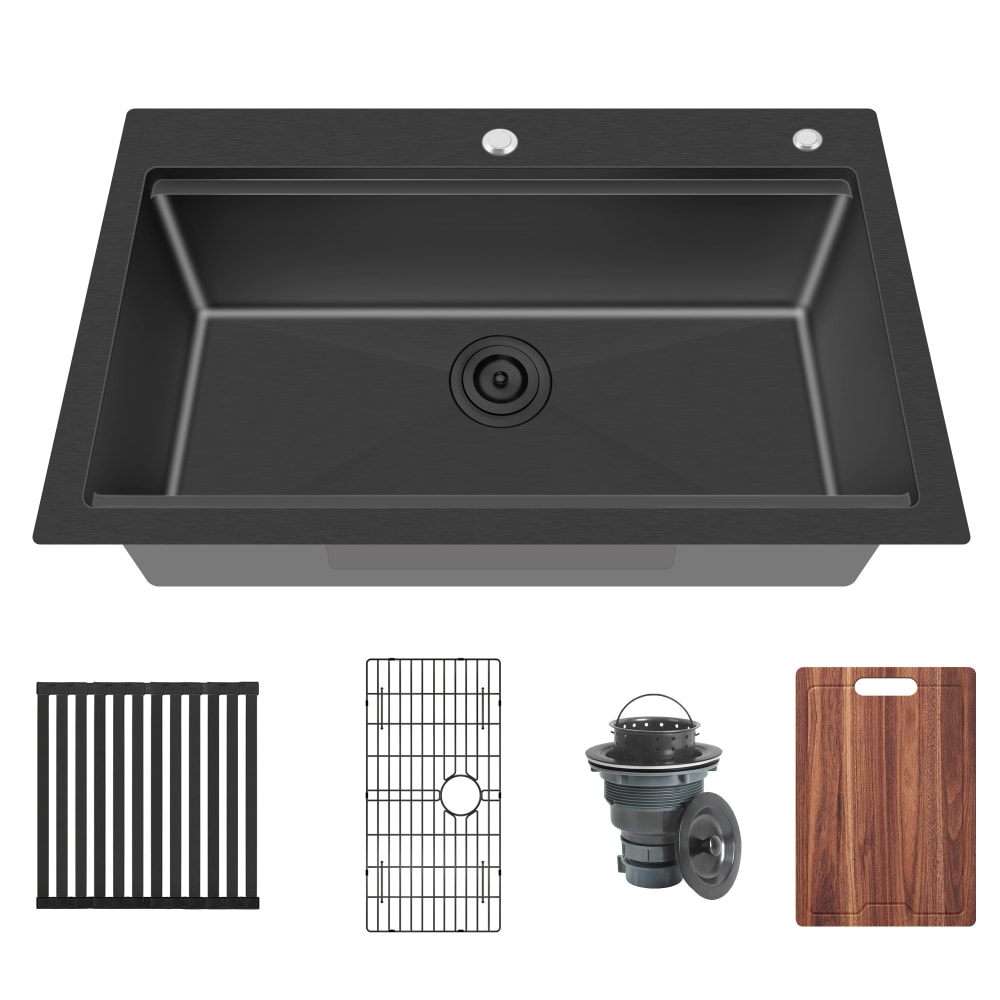 Blenzia 33 Inch Black Workstation Drop In Kitchen Sink 33x22 Topmount 16 Gauge Stainless Steel Gunmetal Black Single Bowl Deep Sinks with Accessories 33" x 22" x 9"
