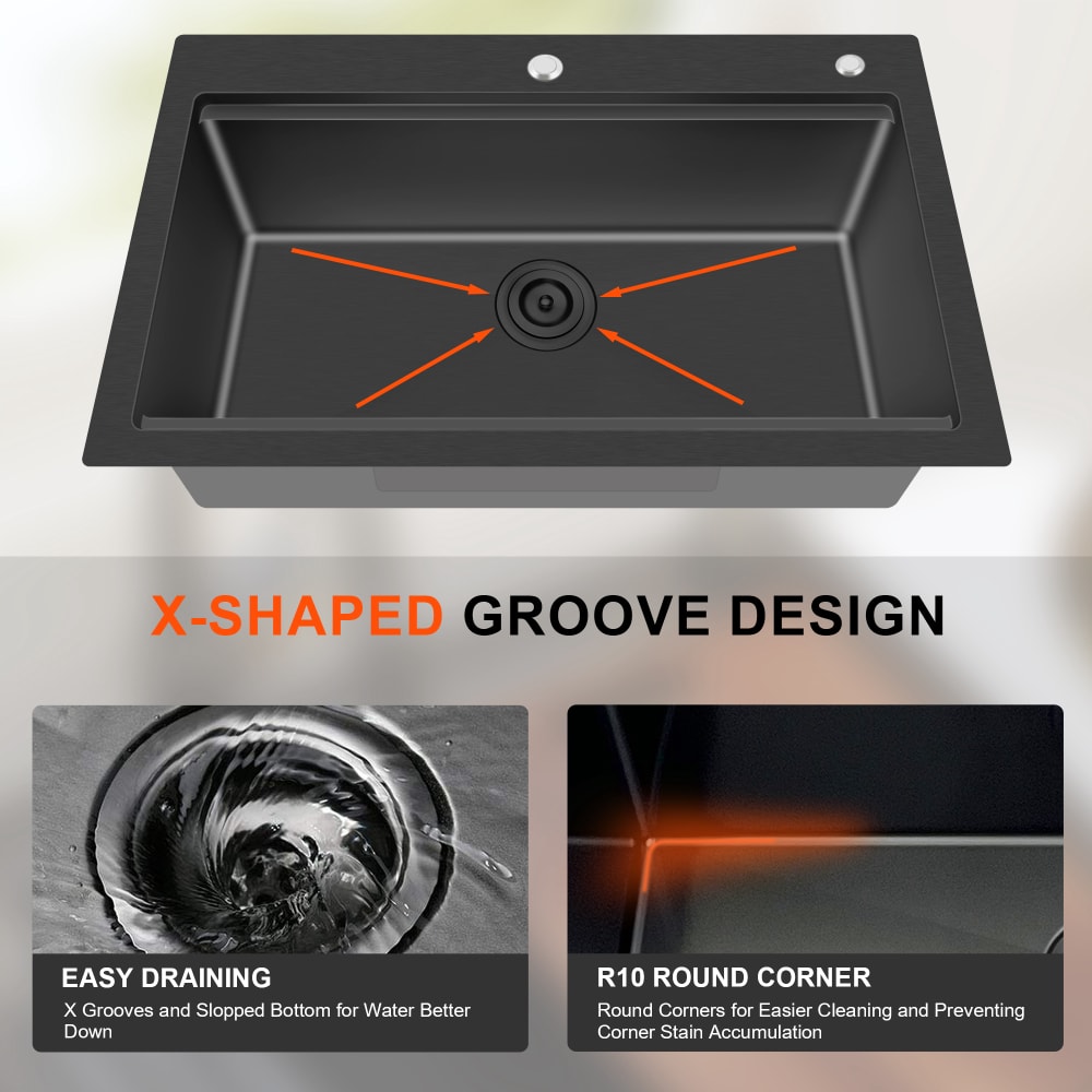 EASY CLEANING & SPACIOUS DEEP BOWL: X-shaped water line and slight slope around the drainage pipe can achieve complete draninage, R10 round corner provides a stylish and modern appearance, while making cleaning easy. A depth of 9 inches is the depth for soaking, scrubbing or cleaning large flat bottomed pots and pans