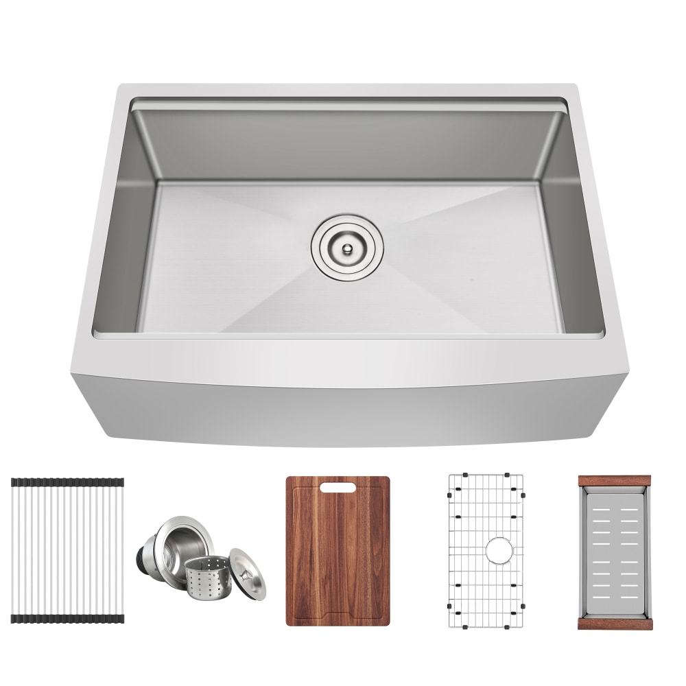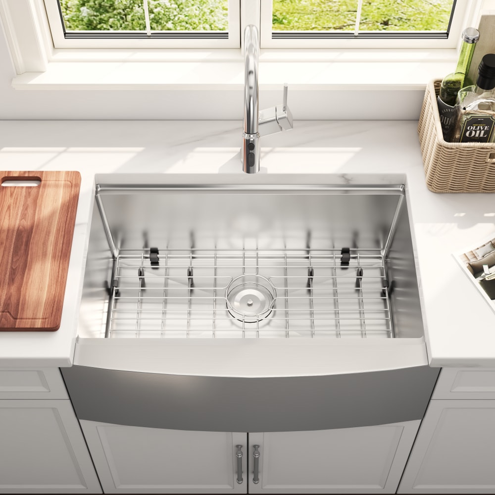 HIGH LEVEL MATERIAL: Blenzia farmhouse sink is made of 16 gauge 304 stainless steel, which is durability, performance and aesthetics, R10 radius corner make easy cleaning, bottom flush grille to prevent dents and scratches for long-term use in busy kitchens, commodity grade satin surface, corrosion-resistant, rust proof and durable