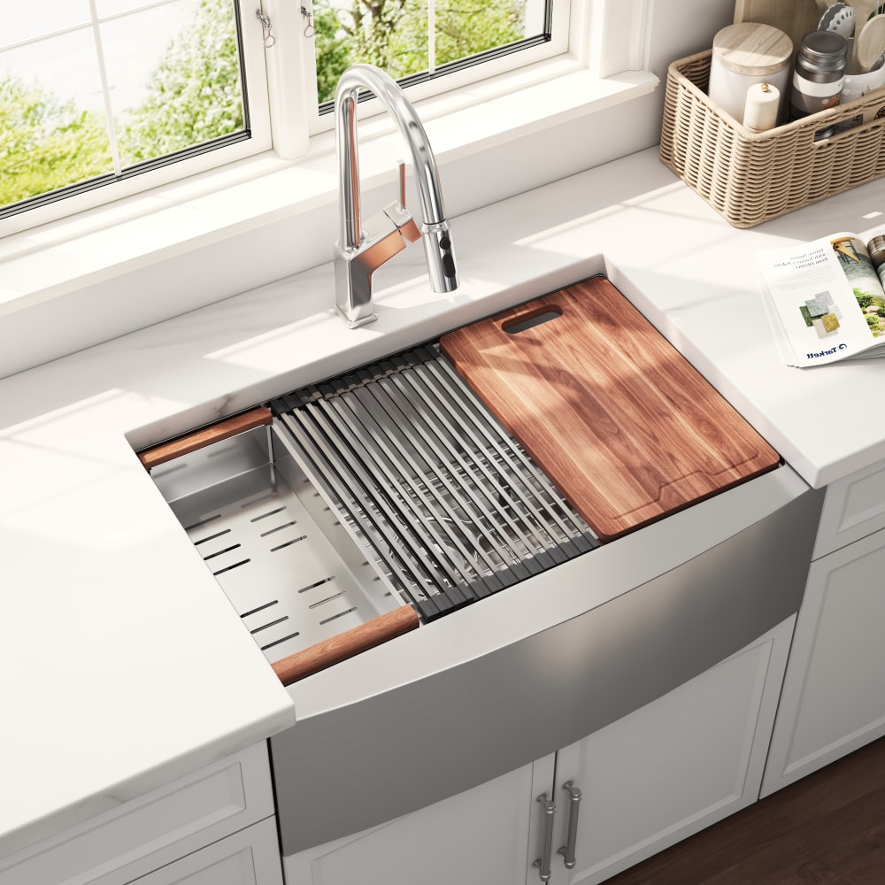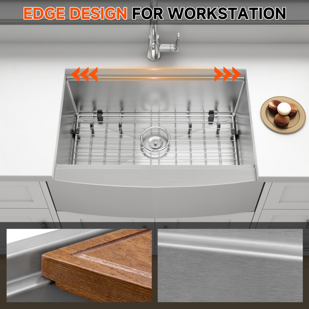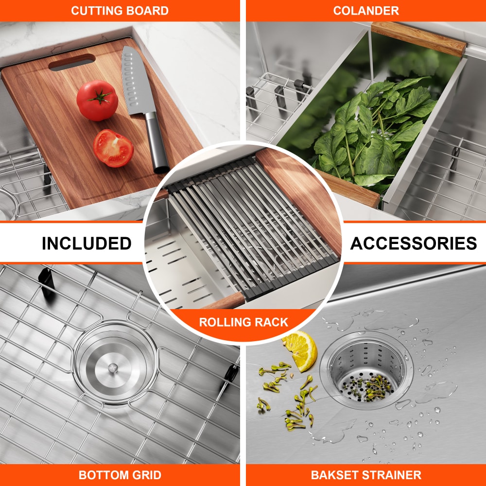 WORKSTATION FUNCTION: Blenzia farmhouse sink provides you with more space to use, making it a functional station for preparing food. The edge stand workstation allows you to slide the accessories on the spoon to hide it when not in use, maximize the cleanliness of the kitchen sink area