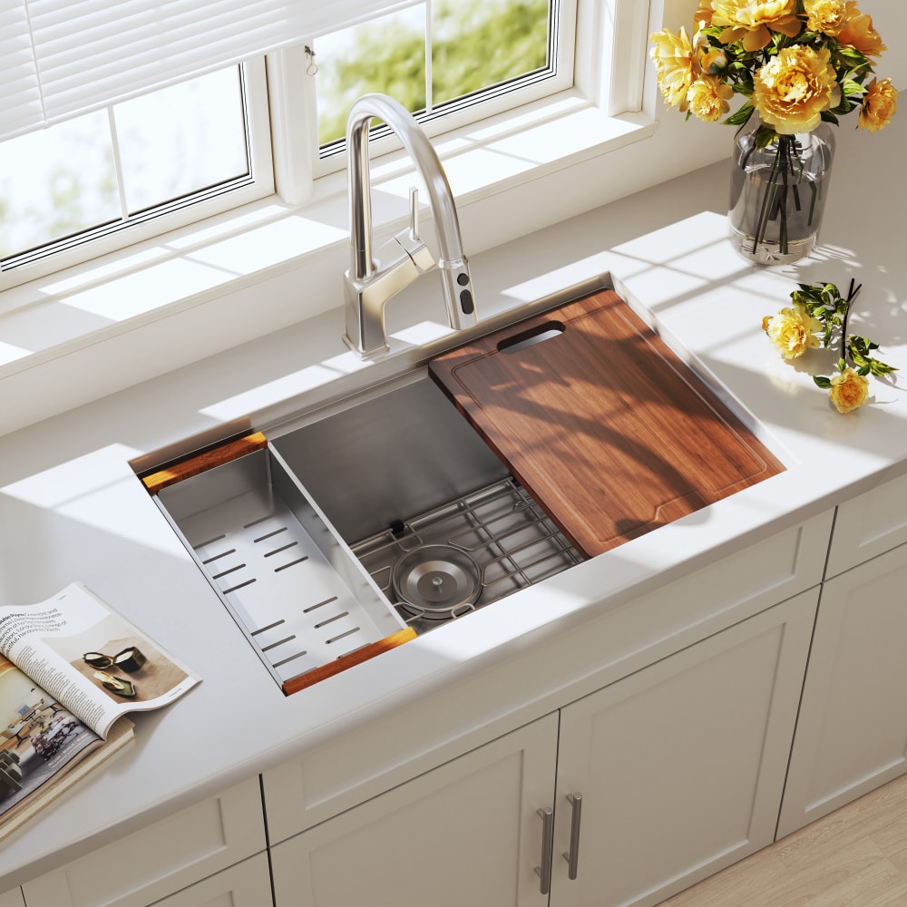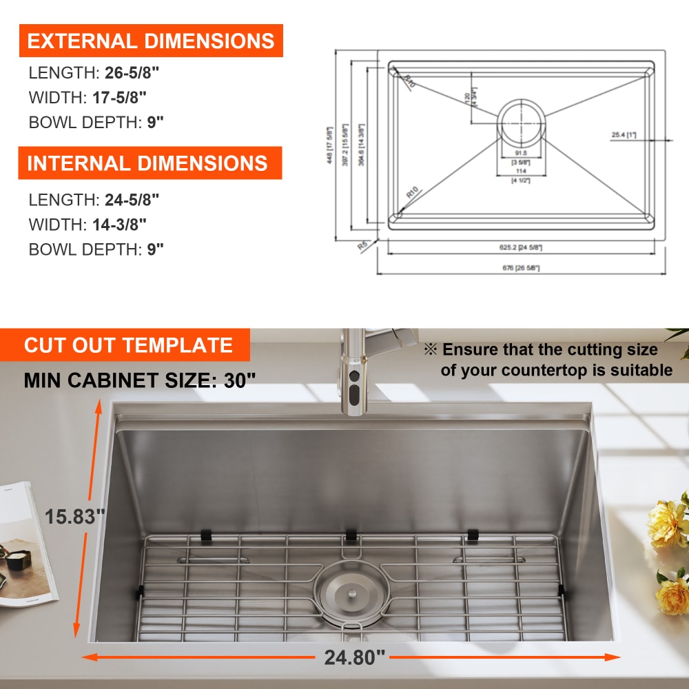 16 GAUGE 304 STAINLESS STEEL: Blenzia 27 inch workstation undermount sink is made of 16 gauge 304 stainless steel, which is more highly durable and rust resistant, its commercial-grade brushed surface is scratch-resistant and easy to clean