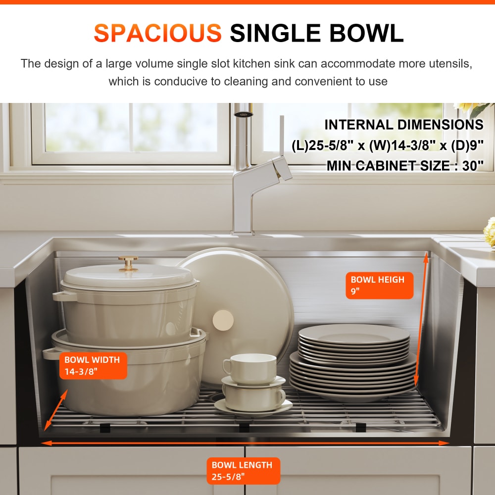 SPACIOUS SINGLE BOWL: The spacious single bowl design can make it easier for you to work in the kitchen. The ample space in the basin can meet all your needs, whether it is for kitchen utensils cleaning or ingredient processing, the use of accompanying accessories can also help you better