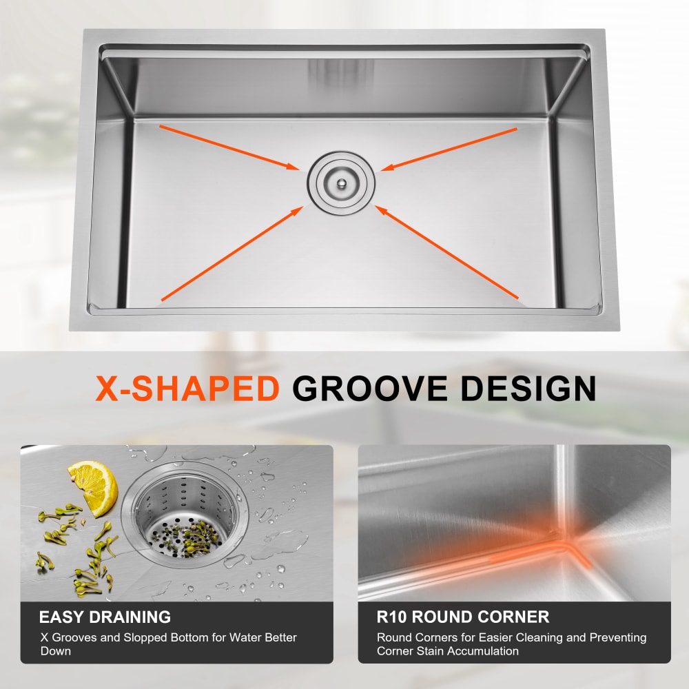 WORKSTATION & FUNCTIONAL: This workstation sink have more functional designs, under the base is equipped with a wall frame for built-in accessories, providing a spacious workspace. The bottom of the sink is designed with an X-shaped groove for easy drainage, ensuring that the kitchen sink remains clean and dry, more importantly the rounded corners of the sink make cleaning easy and eliminate any hidden dirt