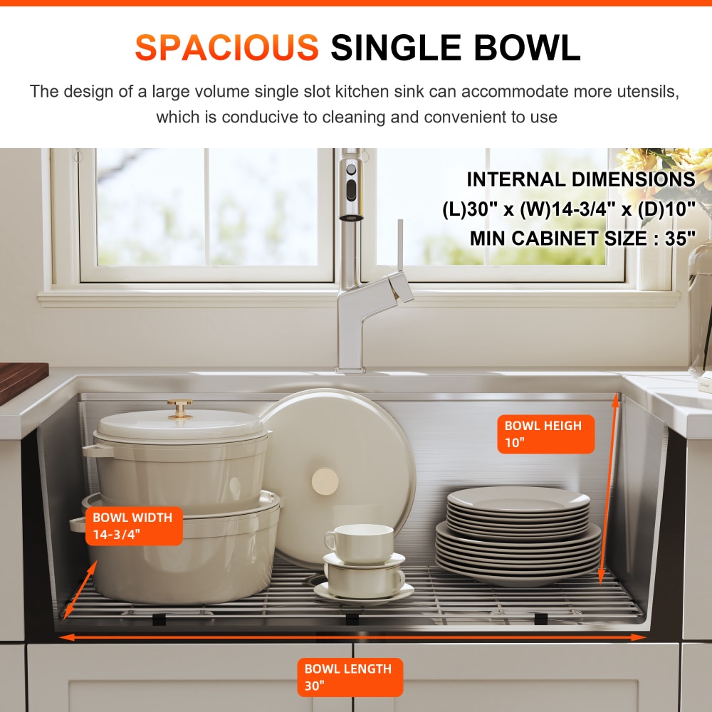 SPACIOUS SINGLE BOWL: The spacious single bowl design can make it easier for you to work in the kitchen. The ample space in the basin can meet all your needs, whether it is for kitchen utensils cleaning or ingredient processing, the use of accompanying accessories can also help you better