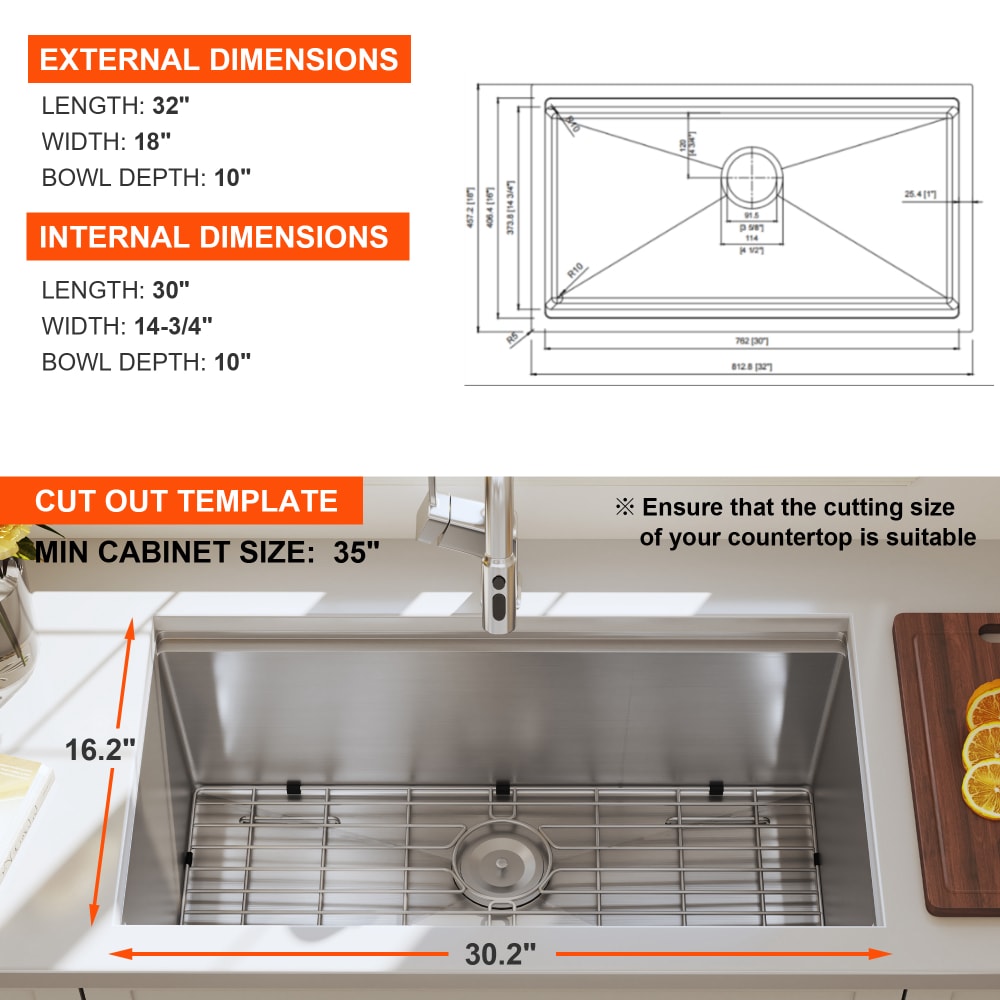 EXTERNAL DIMENSIONS: (L)32" x (W)18" x (D)10" - INTERNAL DIMENSIONS: (L)30" x (W)14-3/4" x (D)10" - MIN CABINET SIZE: 35 Inches / STANDARD DRAIN OPENINGS: 3.5" (fits all US garbage disposal units)