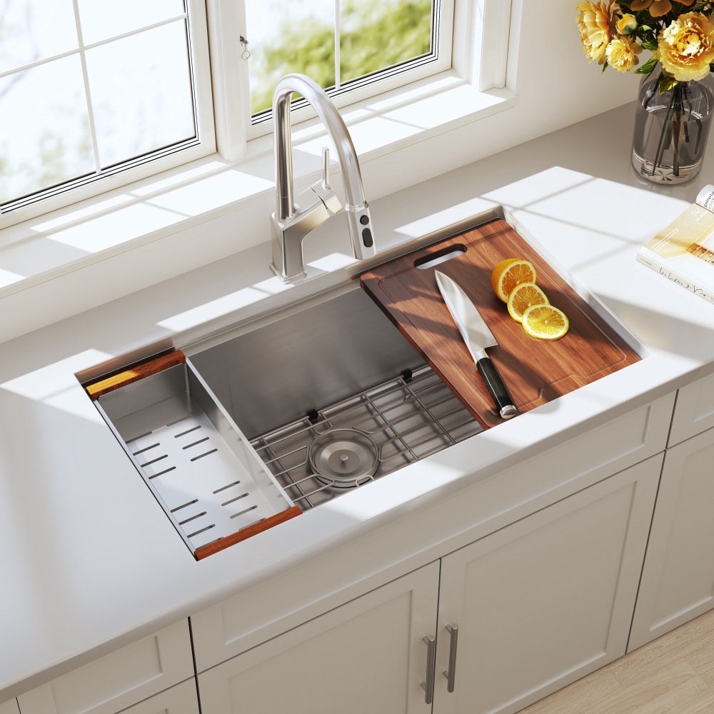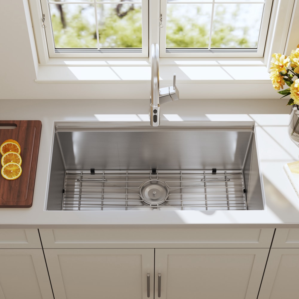 16 GAUGE 304 STAINLESS STEEL: Blenzia 32 inch workstation undermount sink is made of 16 gauge 304 stainless steel, which is more highly durable and rust resistant, its commercial-grade brushed surface is scratch-resistant and easy to clean
