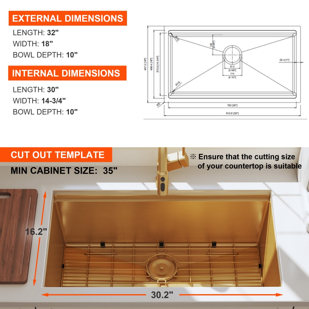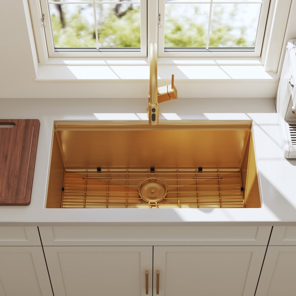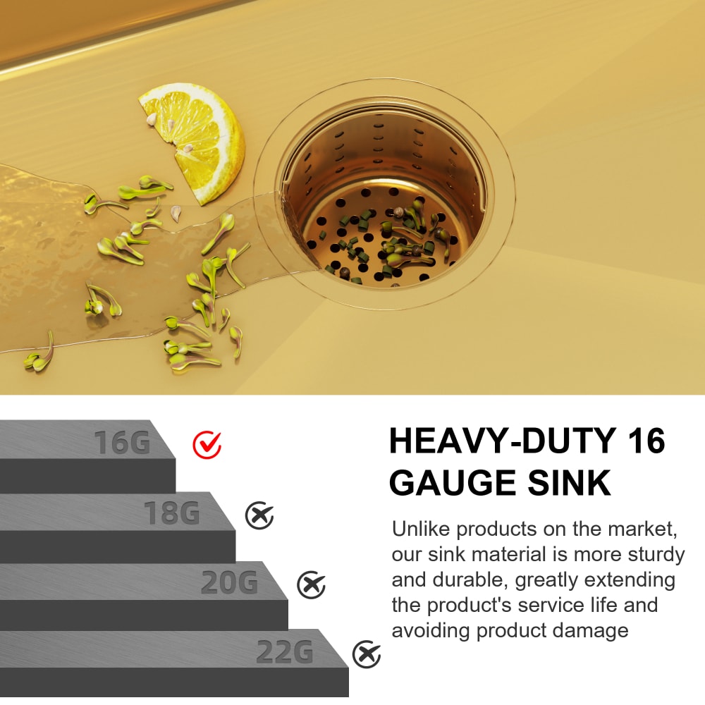 BRUSHED GOLD SURFACE: This sink is made of 16 gauge stainless steel with a brushed gold coating on the surface, making it more scratch resistant and durable while showcasing luxury