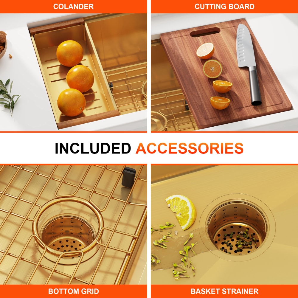 ACCESSORIES INCLUDED: Cutting Board x1 / Colander x1 / Bottom Grid x1 / Basket Strainer x1 / Install Accessories & Template x1 / Shipped to assist your kitchen work, providing a one-stop convenient accessory matching service