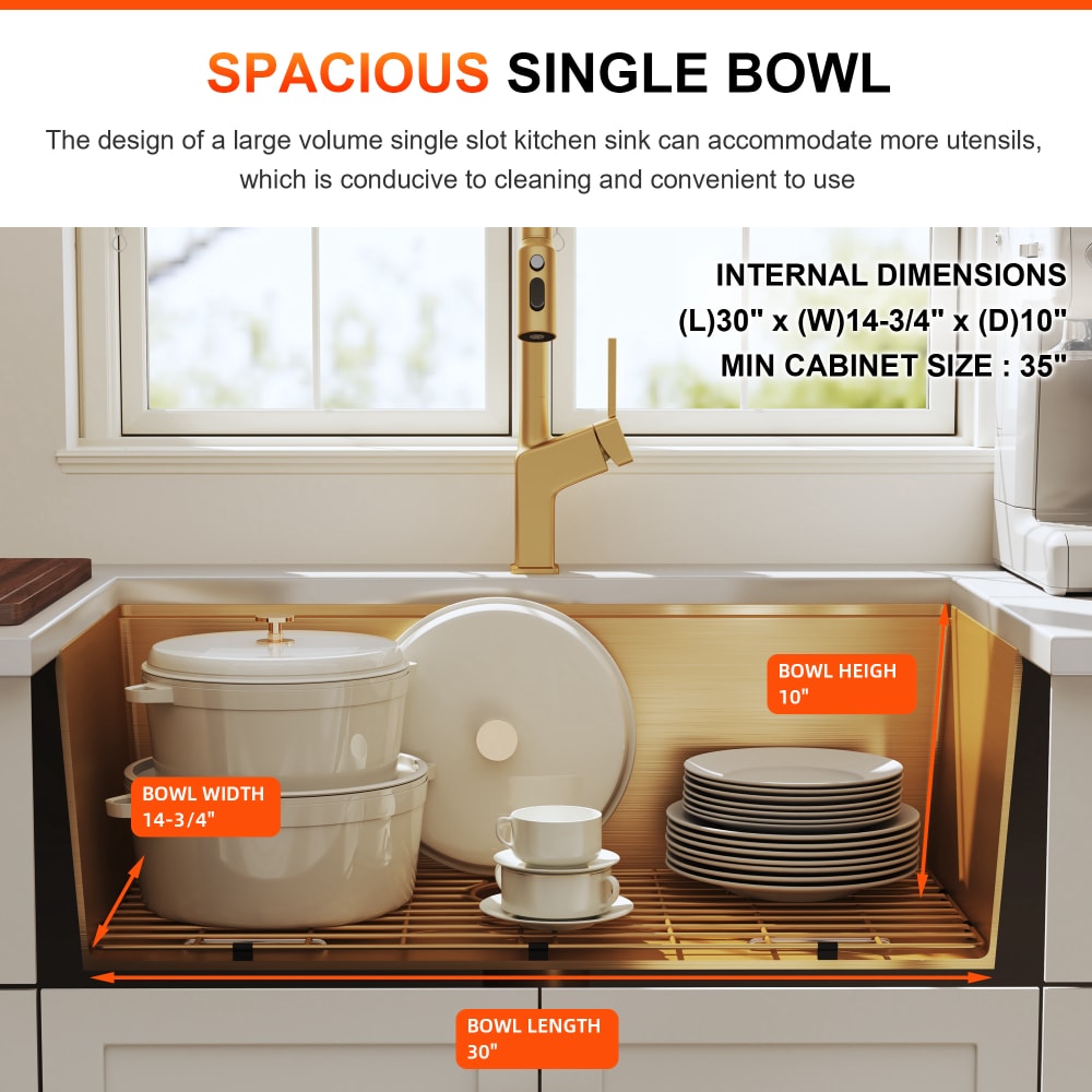 SPACIOUS SINGLE BOWL: The spacious single bowl design can make it easier for you to work in the kitchen. The ample space in the basin can meet all your needs, whether it is for kitchen utensils cleaning or ingredient processing, the use of accompanying accessories can also help you better