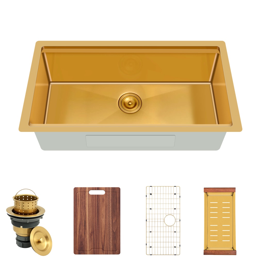 Blenzia 32 Inch Gold Undermount Workstation Kitchen Sink 16 Gauge Stainless Steel Single Bowl Handmade Sinks with Ledge and Accessories 32" x 18" x 10"