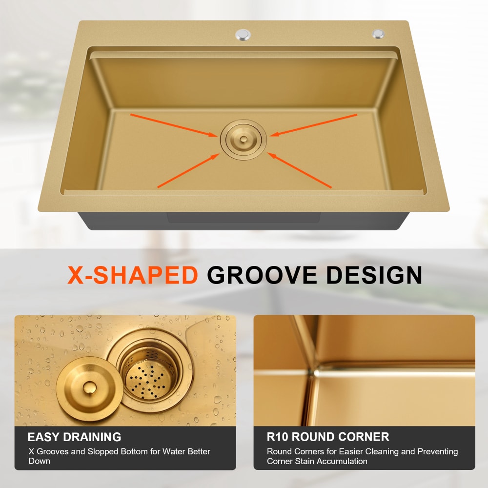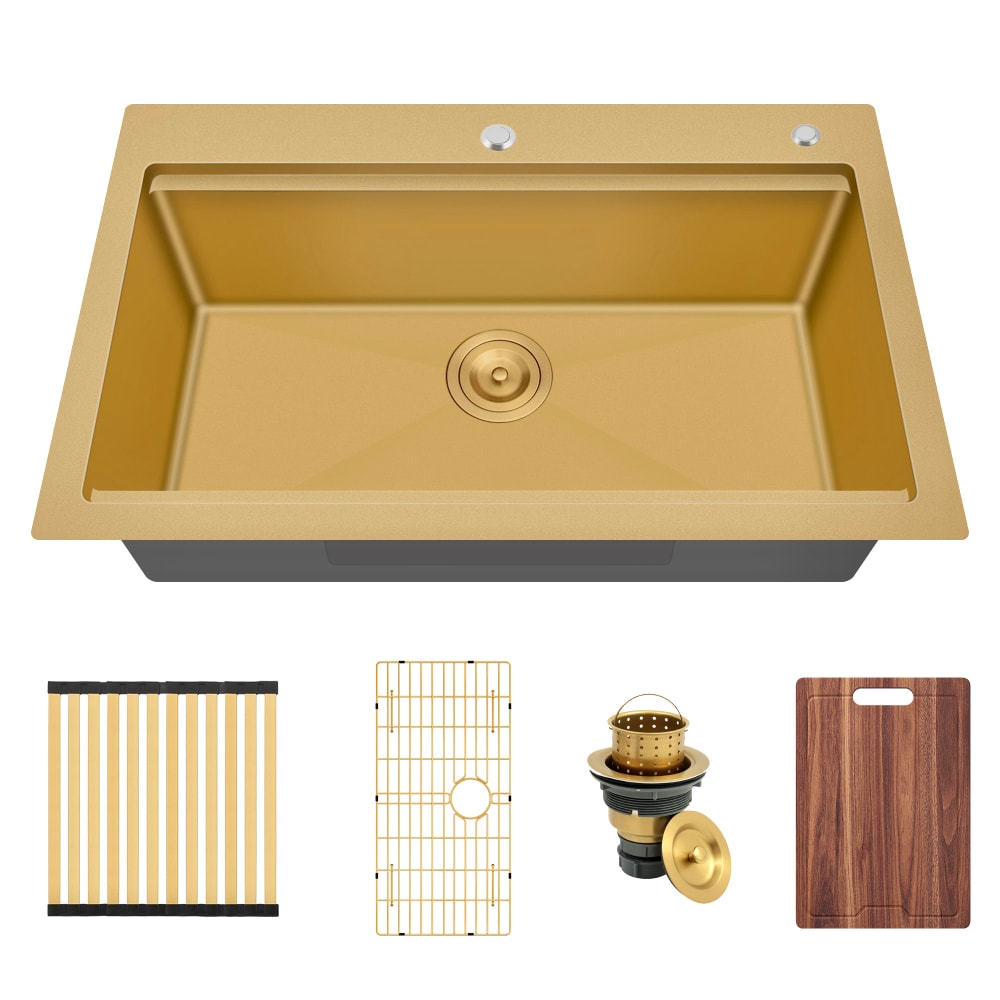 Blenzia 33 Inch Gold Workstation Drop In Kitchen Sink 33x22 Topmount 16 Gauge Stainless Steel Single Bowl Deep Sinks with Accessories 33" x 22" x 9"