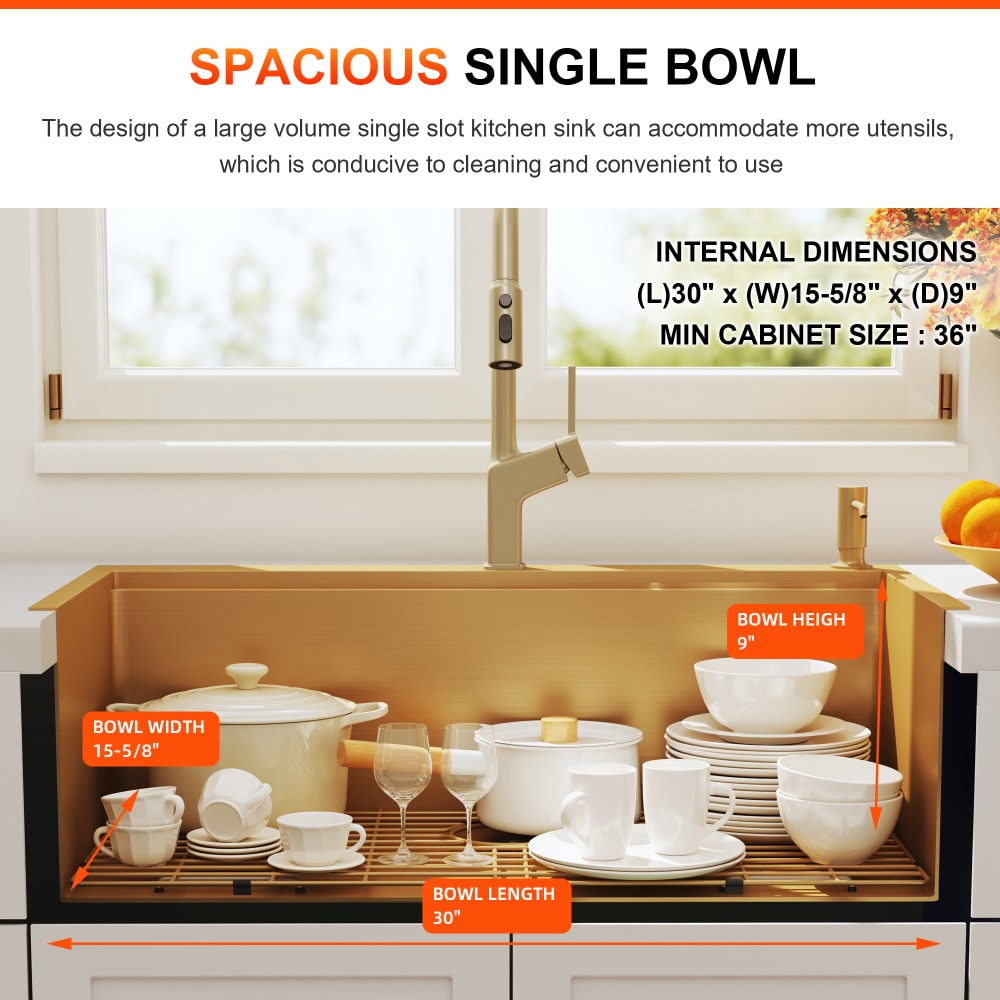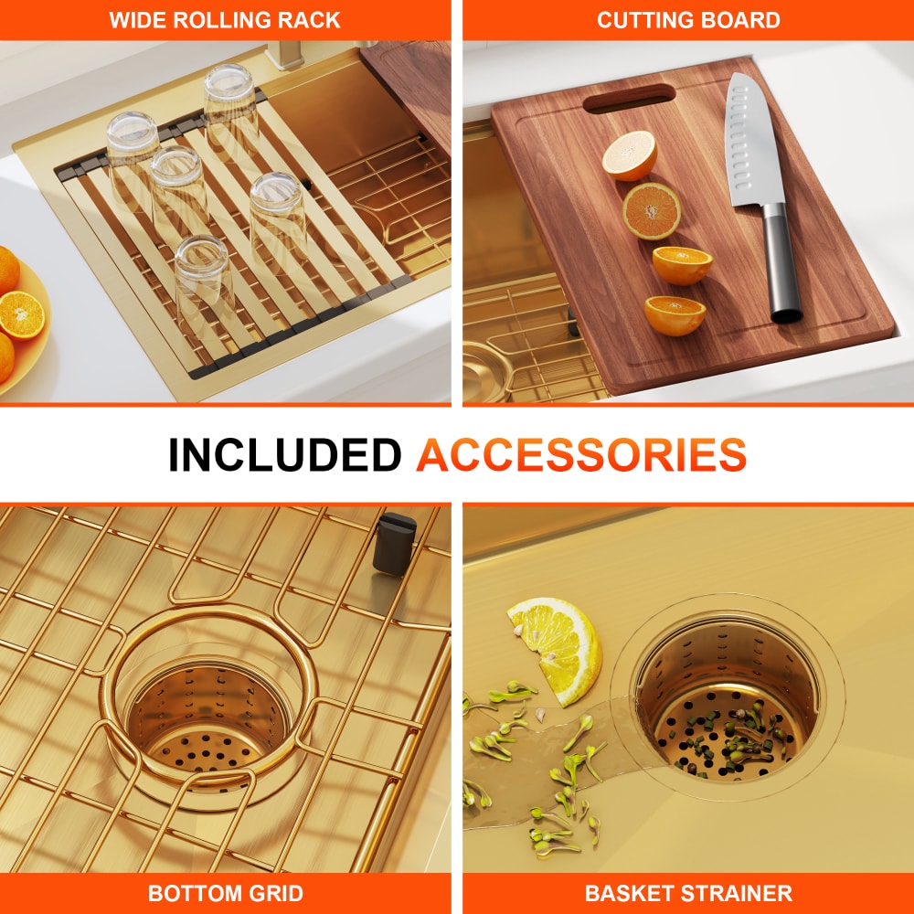 COMPLETE FUNCTIONAL ACCESSORIES: Gold Basket Strainer x1 / Gold Bottom Grid x1 / Cutting Board x1 / Gold Wide Rolling Rack x1 / Installation Instructions and Accessories x1 / All you needed is included in one safety package