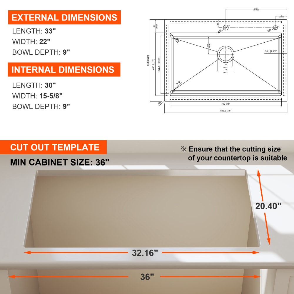 WORKSTATION FUNCTION: Blenzia 33x22 inch workstation sink provides you with more space to use, making it a functional station for preparing food. The edge stand workstation allows you to slide the cutting board and rolling rack on the spoon to hide it when not in use, maximize the cleanliness of the kitchen sink area