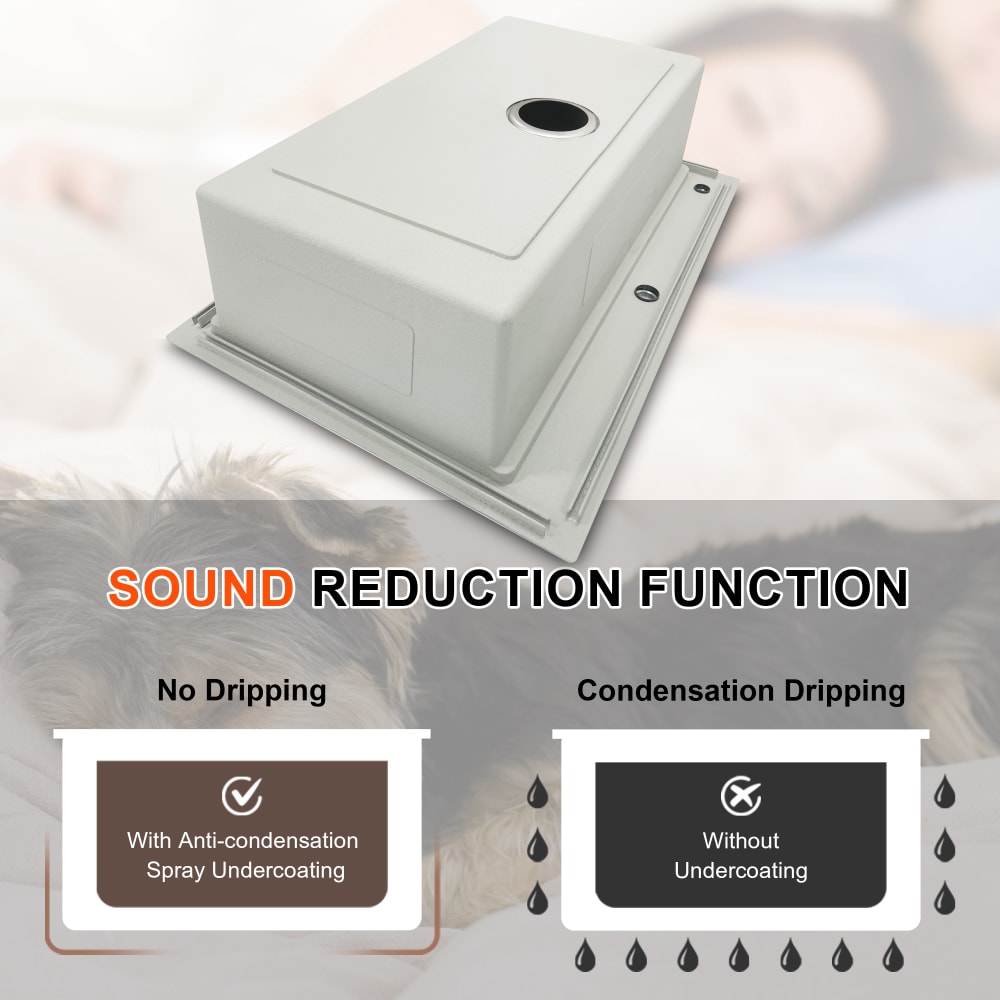 SOUND REDUCTION FUNCTION: The sink is equipped with sound-absorbing pads around and at the bottom, which can greatly reduce the noise generated during use, the external coating can prevent condensation from accumulating