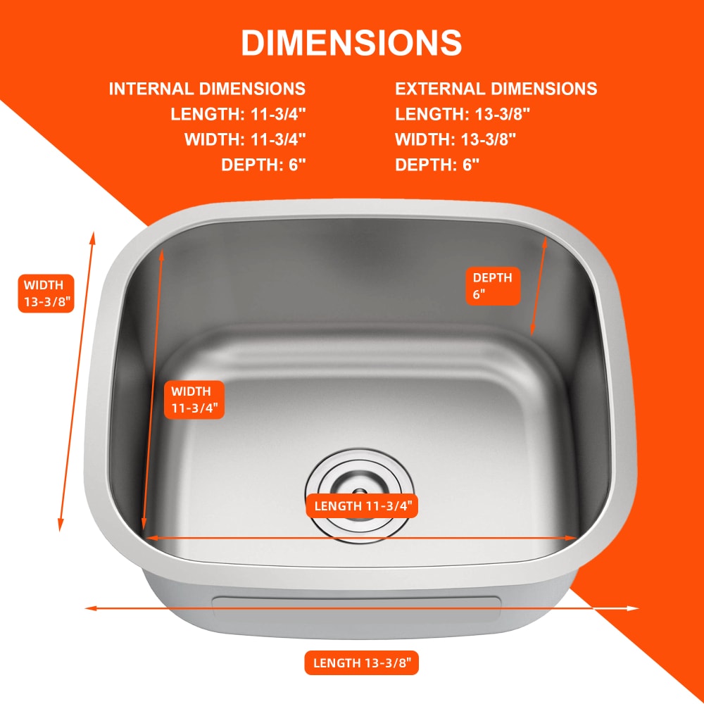 EXTERNAL DIMENSIONS: (L)13-3/8" x (W)13-3/8" x (D)6" - INTERNAL DIMENSIONS: (L)11-3/4" x (W)11-3/4" x (D)6" - MIN CABINET SIZE: 17 Inches / STANDARD DRAIN OPENINGS: 3.5" (fits all US garbage disposal units)