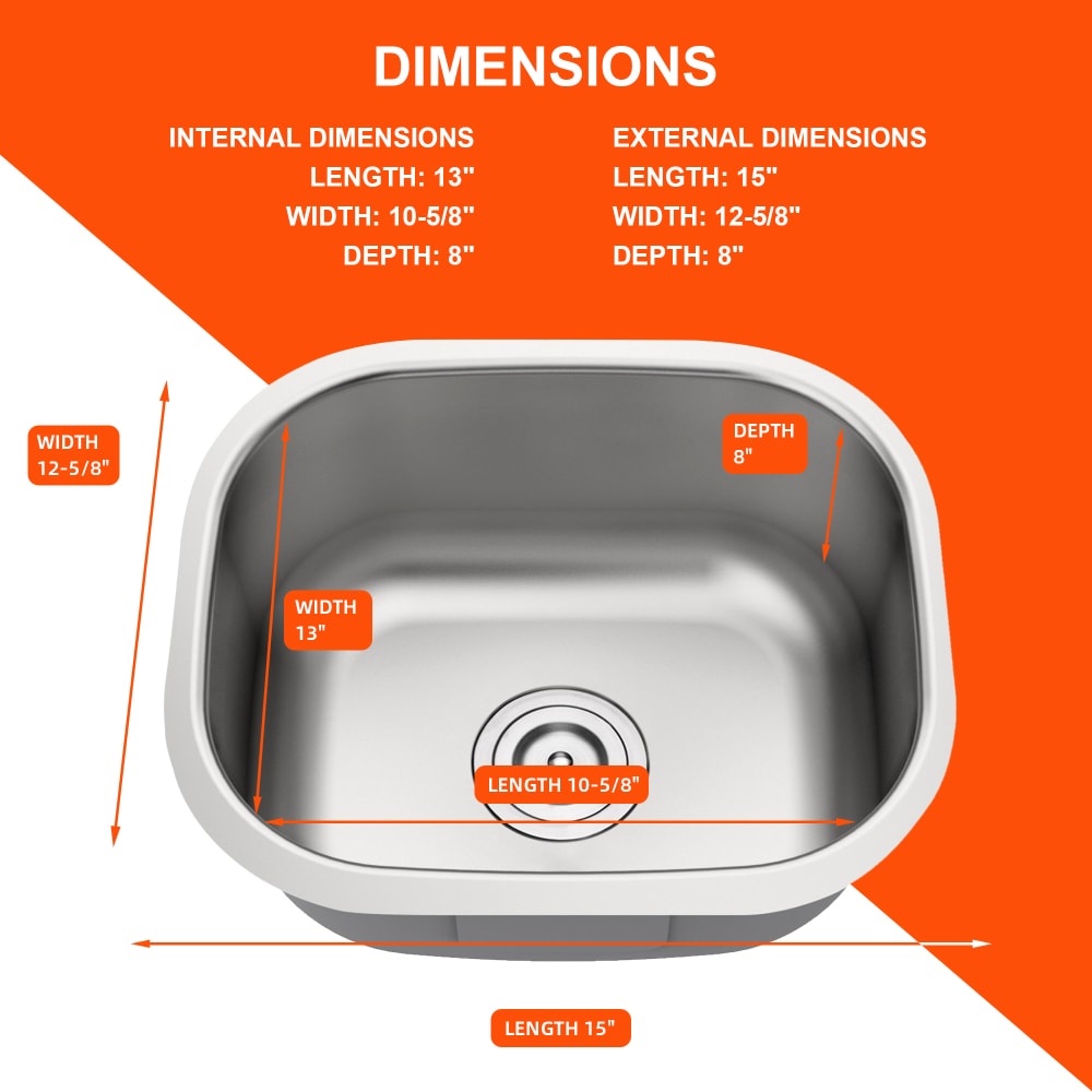 EXTERNAL DIMENSIONS: (L)15" x (W)12-5/8" x (D)8" - INTERNAL DIMENSIONS: (L)13" x (W)10-5/8" x (D)8" - MIN CABINET SIZE: 18 Inches / STANDARD DRAIN OPENINGS: 3.5" (fits all US garbage disposal units)
