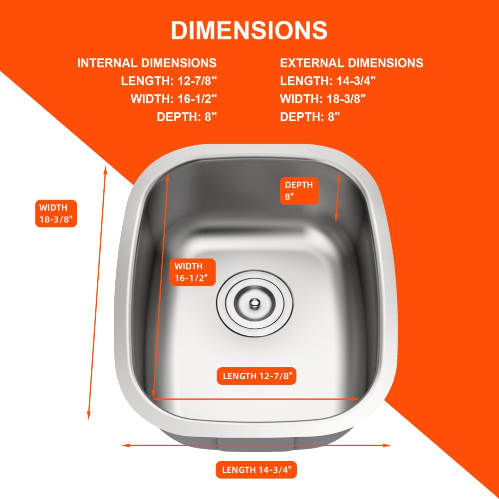 EXTERNAL DIMENSIONS: (L)14-3/4" x (W)18-3/8" x (D)8" - INTERNAL DIMENSIONS: (L)12-7/8" x (W)16-1/2" x (D)8" - MIN CABINET SIZE: 18 Inches / STANDARD DRAIN OPENINGS: 3.5" (fits all US garbage disposal units)