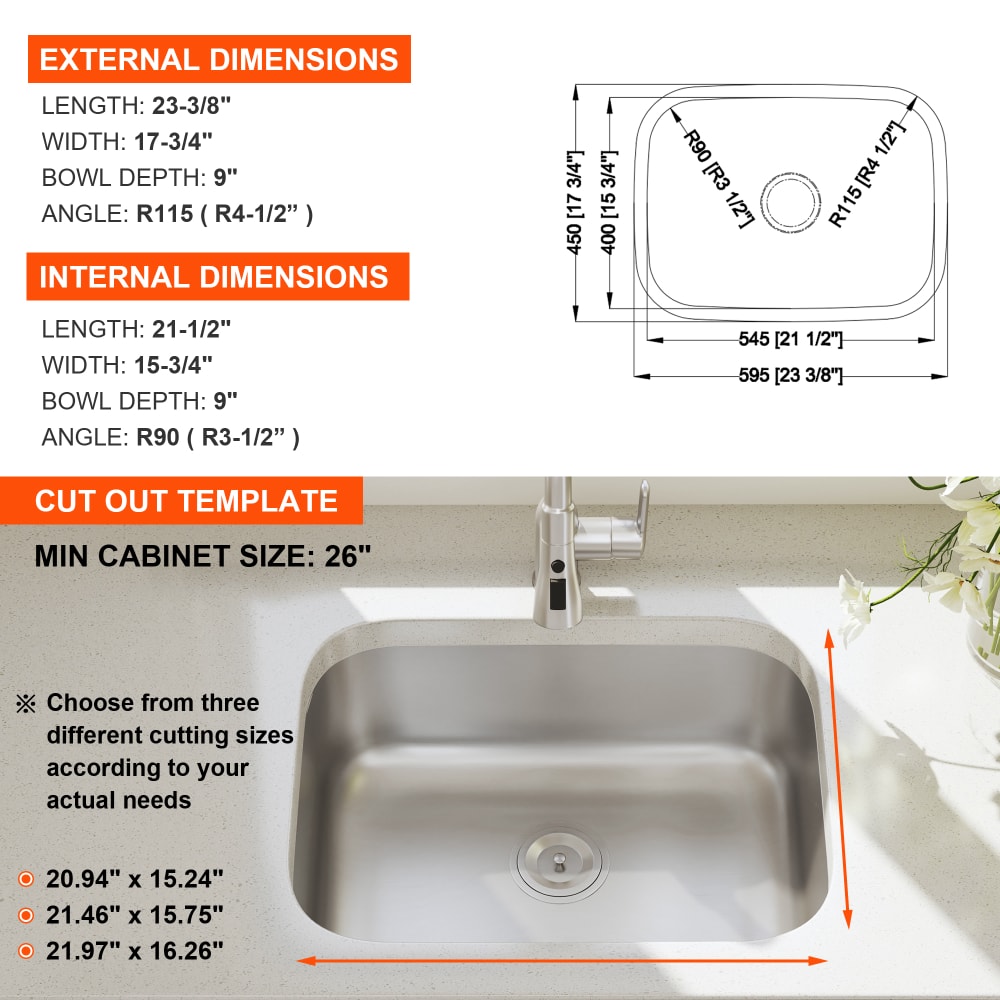 MULTI OPTIONS: This series of sinks comes in four different sizes(23" / 27" / 30" / 32"), each with a different R-angle(R90 / R80 / R65 / R95), you can choose according to your actual situation