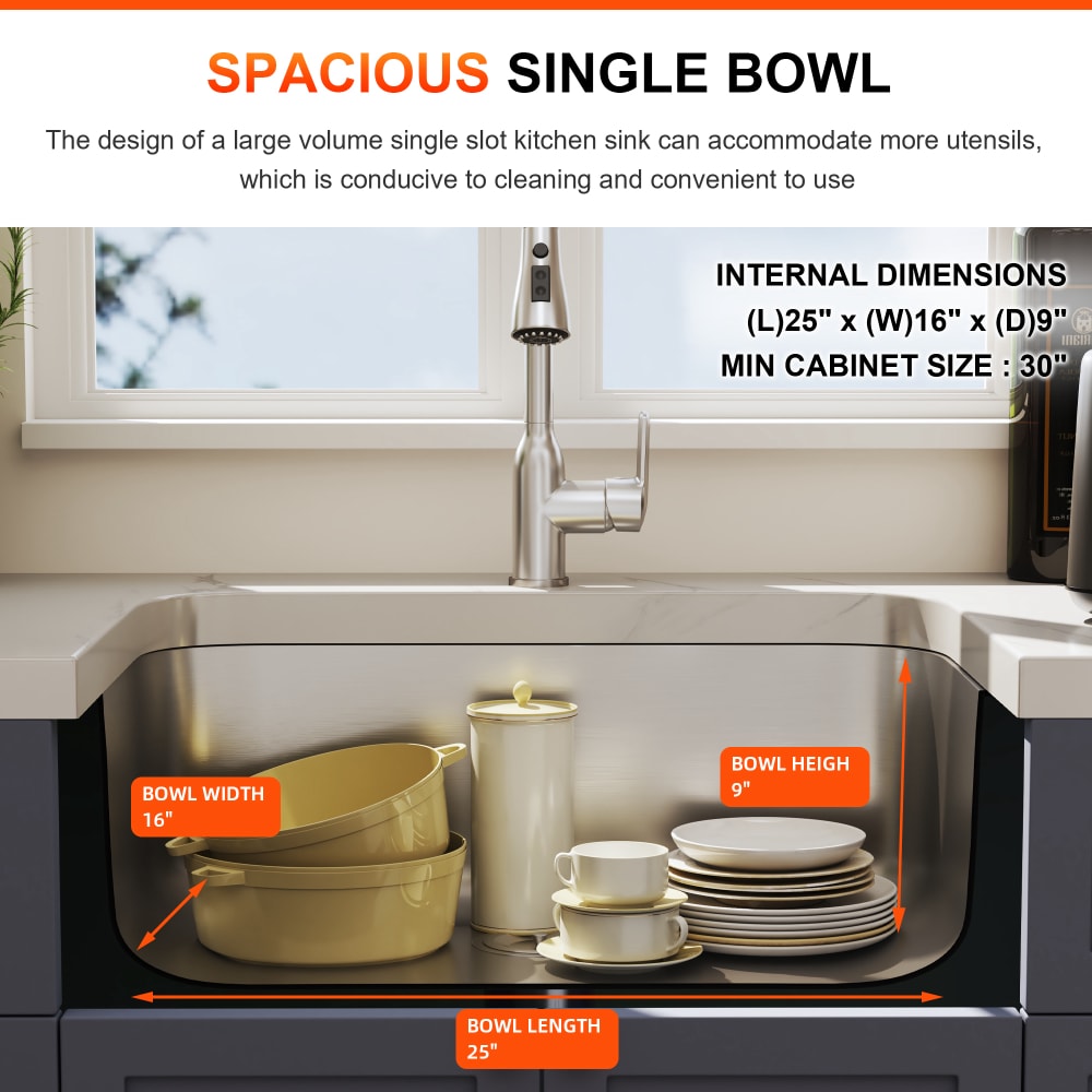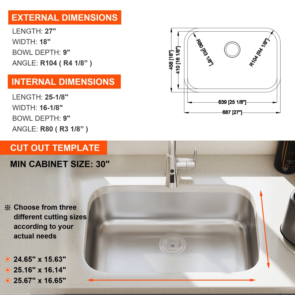 MULTI OPTIONS: This series of sinks comes in four different sizes(23" / 27" / 30" / 32"), each with a different R-angle(R90 / R80 / R65 / R95), you can choose according to your actual situation