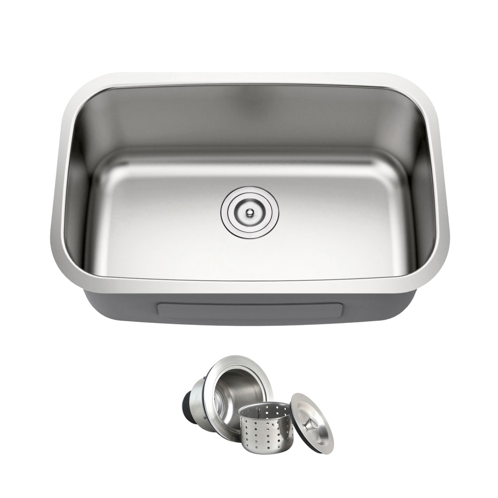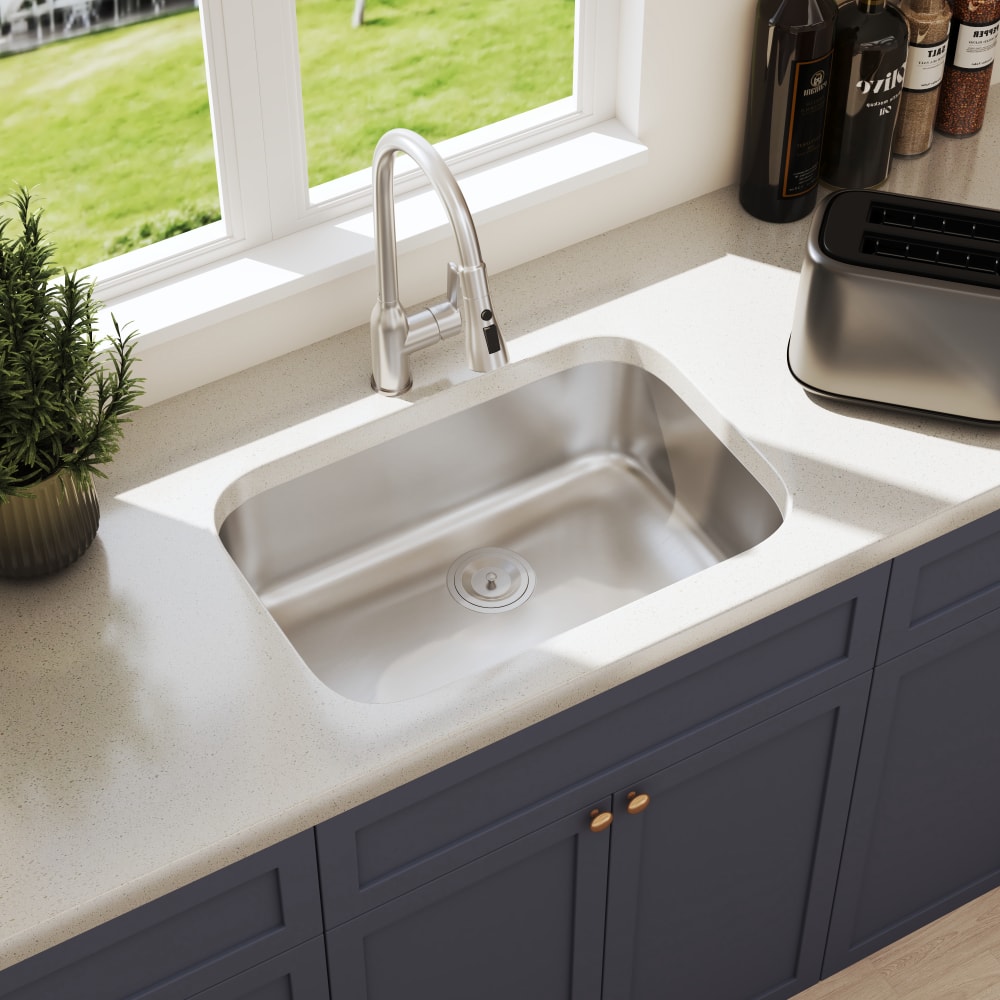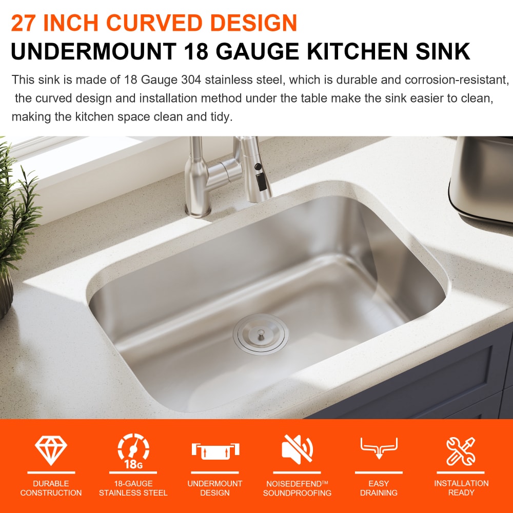 Blenzia 27 Inch Undermount Kitchen Sink 18 Gauge Stainless Steel Single Bowl Curved Shape Sink Brushed Nickel with Strainer 27" x 18" x 9"