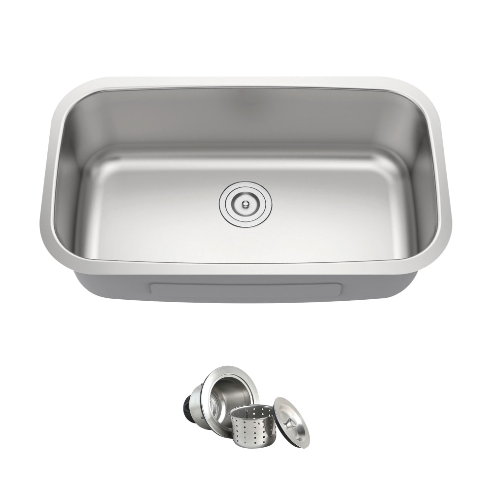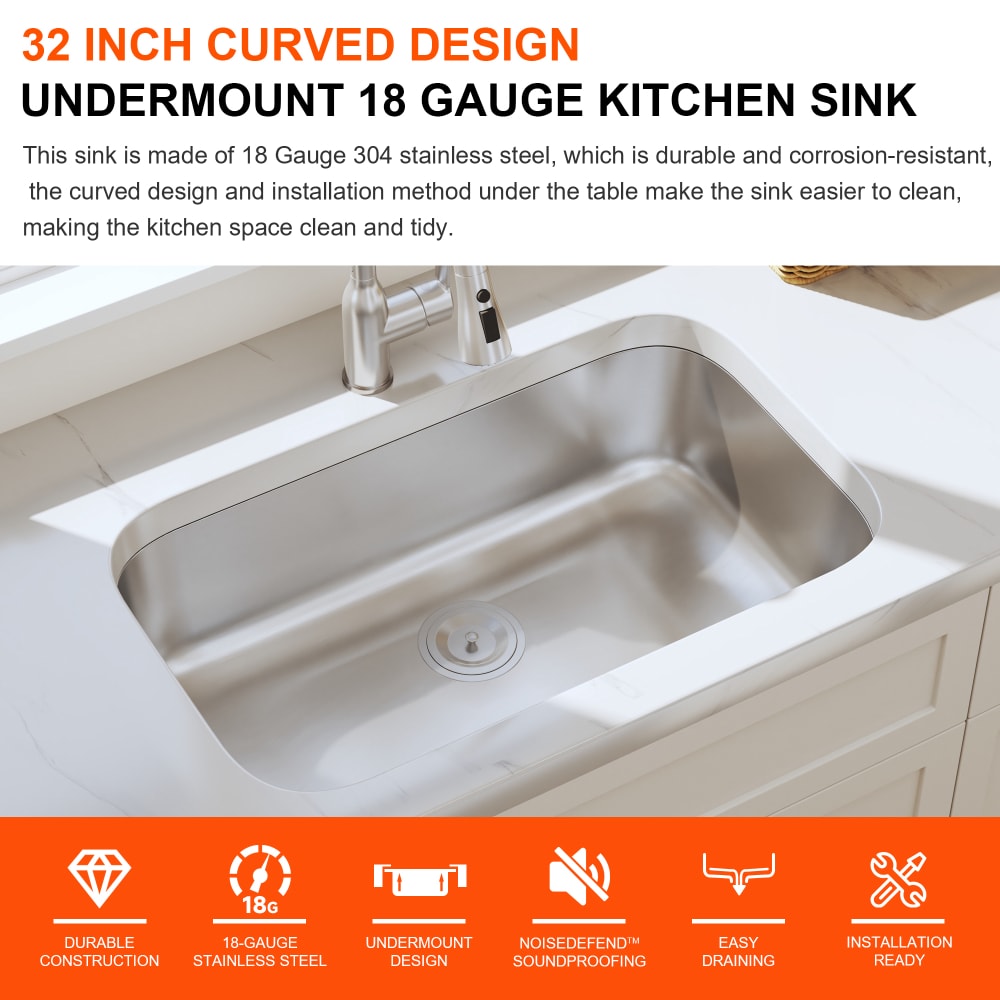 Blenzia 32 Inch Undermount Kitchen Sink 18 Gauge Stainless Steel Single Bowl Curved Shape Sink with Strainer 32" x 18" x 9"