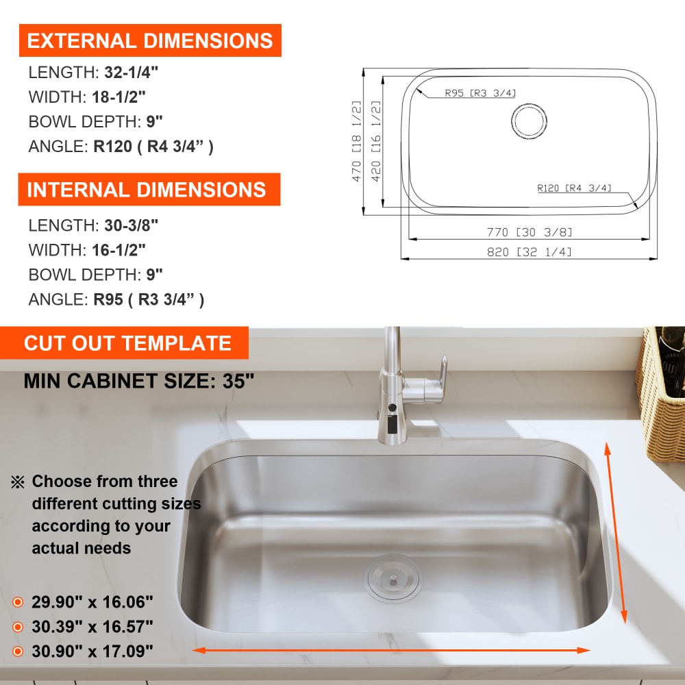 MULTI OPTIONS: This series of sinks comes in four different sizes(23" / 27" / 30" / 32"), each with a different R-angle(R90 / R80 / R65 / R95), you can choose according to your actual situation