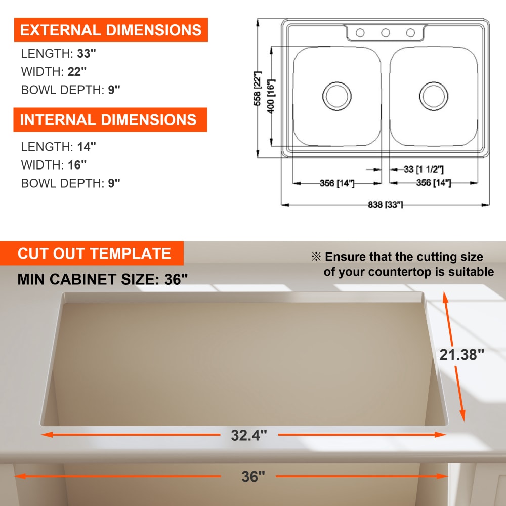 EXTERNAL DIMENSIONS: (L)33" x (W)22" x (D)9" - INTERNAL DIMENSIONS: (L)14" x (W)16" x (D)9" - MIN CABINET SIZE: 36 Inches / STANDARD DRAIN OPENINGS: 3.5" (fits all US garbage disposal units)