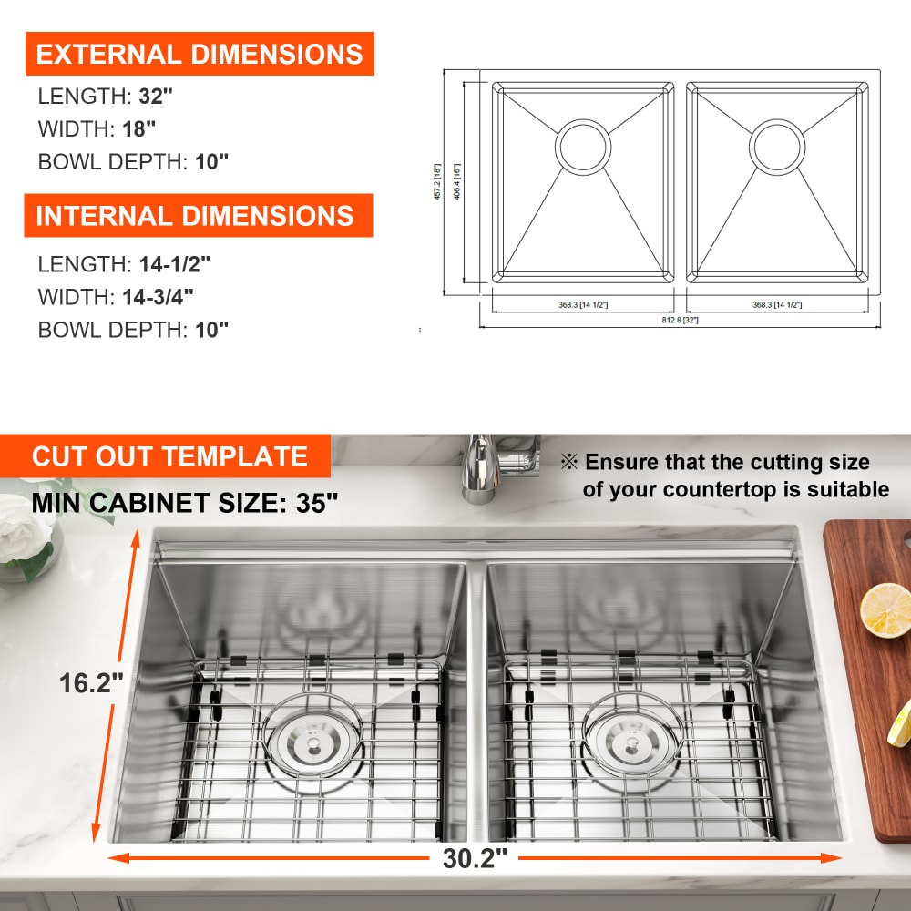 EXTERNAL DIMENSIONS: (L)32" x (W)18" x (D)10" - INTERNAL DIMENSIONS: (L)14-1/2" x (W)14-3/4" x (D)10" - MIN CABINET SIZE: 35 Inches / STANDARD DRAIN OPENINGS: 3.5" (fits all US garbage disposal units)