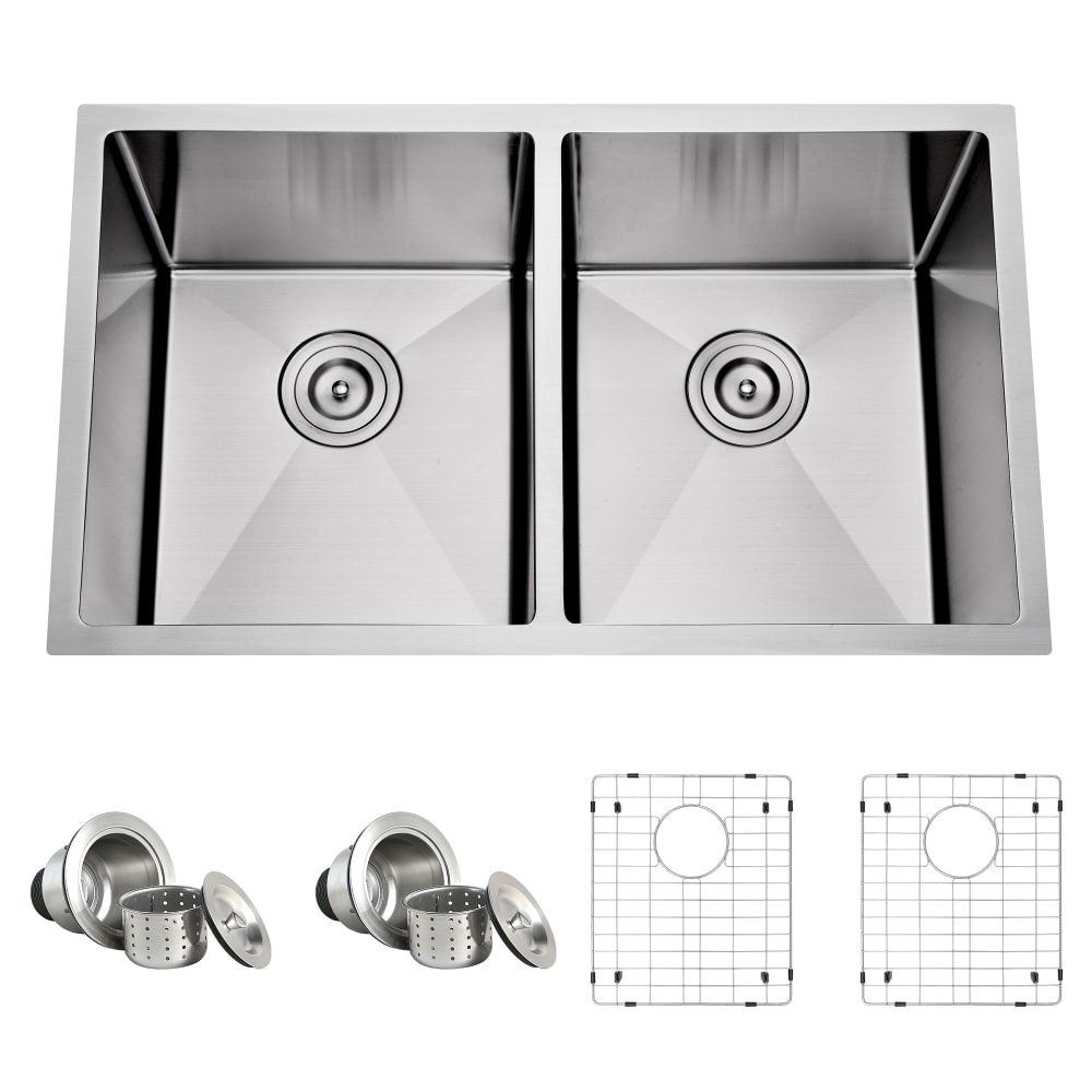 Blenzia 32 Inch Undermount Double Bowl Kitchen Sink Handmade 16 Gauge Stainless Steel 50/50 Deep Sinks with Strainer & Bottom Grid 32" x 19" x 10"
